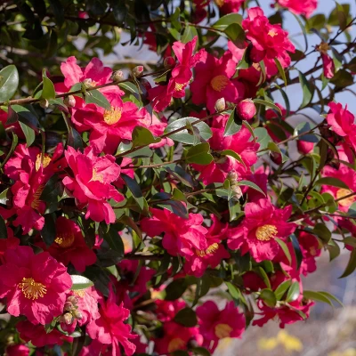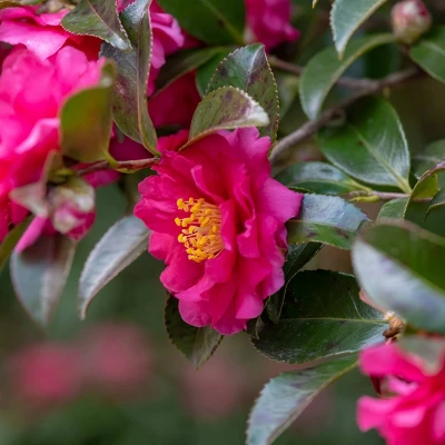 Versatile and beautiful, the Camellia Sasanqua ‘Shi Shi Gashira’ provides fall to winter blooms that are guaranteed to impress. A combination of pink, semi-double blooms and golden yellow centers contrast with its glossy, dark green foliage for a beautiful showing. The compact growth habit and slow growth rate make ‘Shi Shi Gashira’ an excellent choice for small gardens, containers and basically anywhere a smaller shrub is needed.