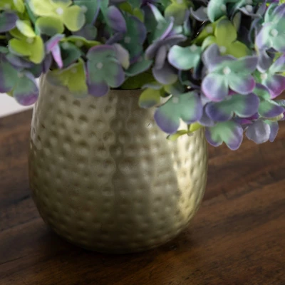 Sometimes, all it takes to brighten your day and space is a colorful flower arrangement. Our artificial hydrangea arrangement, inspired by nature, provides a splash of vibrant color, ideal for any space. Made with premium materials, the lifelike petals are adjustable, allowing you to tailor the look to your preference. At 11″ tall, this arrangement comes in a gold textured vase, making it an ideal size for both tabletops and shelves. Enhance the ambiance of your next dinner party by featuring it as a stunning centerpiece, adding a touch of elegance and joy to your gatherings.