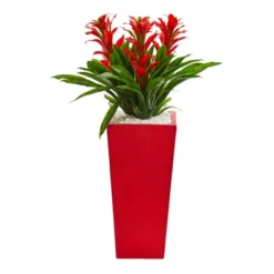 Nearly Natural Triple Bromeliad Artificial Plant In Red Planter, Red